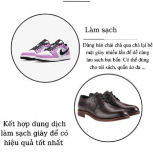 Kết hợp dung dịch làm sạch: Cho một lượng vừa đủ dung dịch vệ sinh giày lên bàn chải hoặc trực tiếp lên vết bẩn. Chà nhẹ nhàng theo chuyển động tròn để tạo bọt và đánh tan vết bẩn.